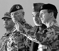 | British Gen. David Richards, right, outgoing commander of NATO-led International Security Assistance Force (ISAF), speaks with Afghan President Hamid Karzai as German Gen. Egon Ramms, second from left, and new commander U.S. Army Gen. Dan McNeill look on during the change of command ceremony in Kabul, Afghanistan | |||||||||||